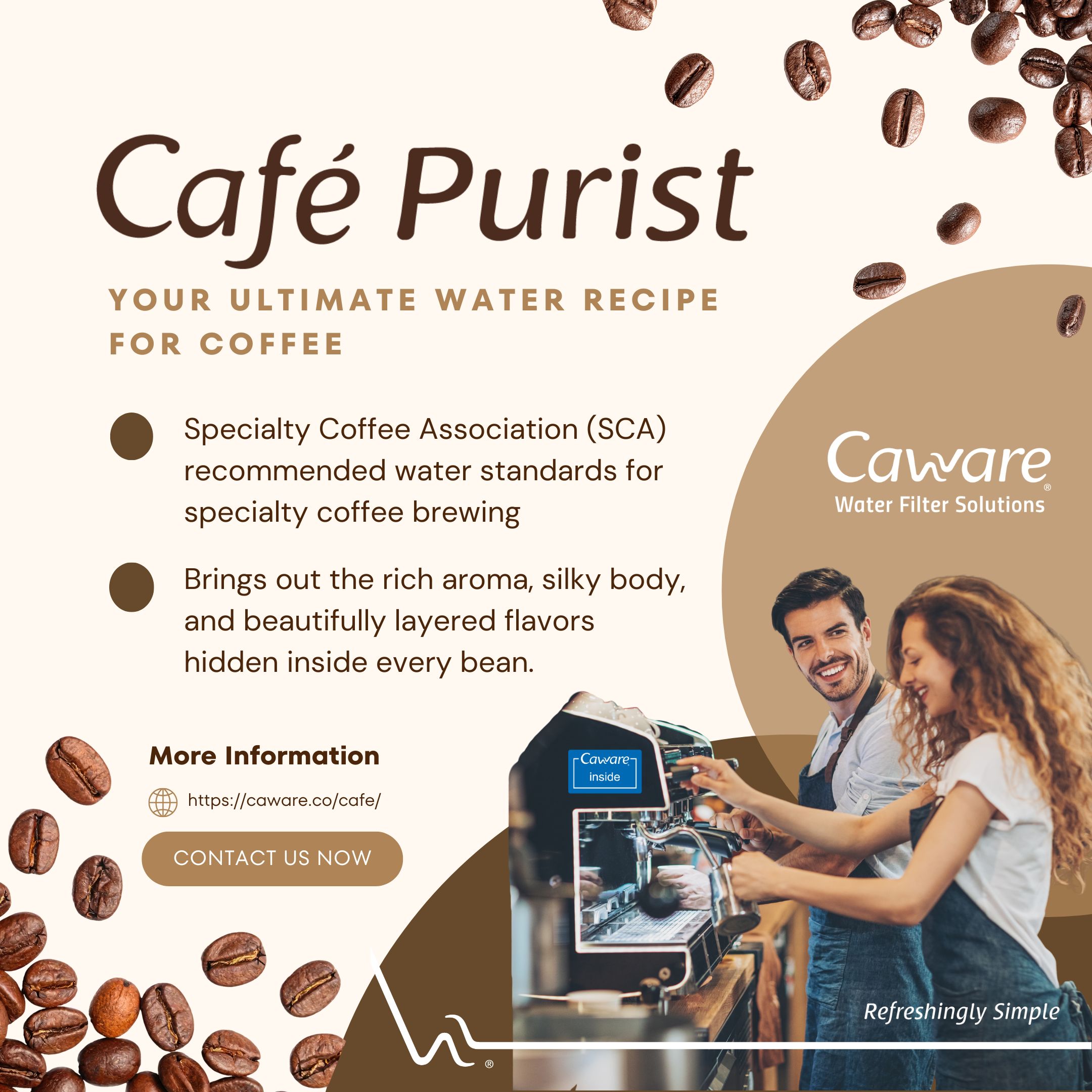 Caware adopts 100% wetted parts, which are FDA compliant with recyclable material of ECO-friendly grade and Halogen free. Caware provides clean water with no power consumption, no drain wasted, and no harmful contaminants to deliver sustainability.